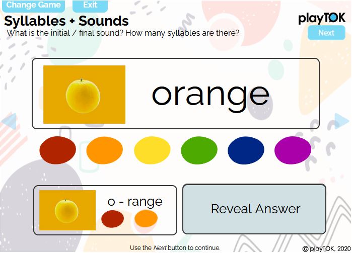 After you guess, lift the “Reveal Answer” to show you the correct number (e.g., in this case, a red and orange dot to indicate 2 syllables).