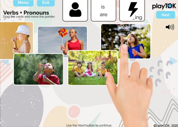 - Use playTOK Verbs + Pronouns Photo Set 1 to: talk about the subjects (either boy/girl/people, or he/she/they), discuss the action words, or practice a simple present progressive sentence.